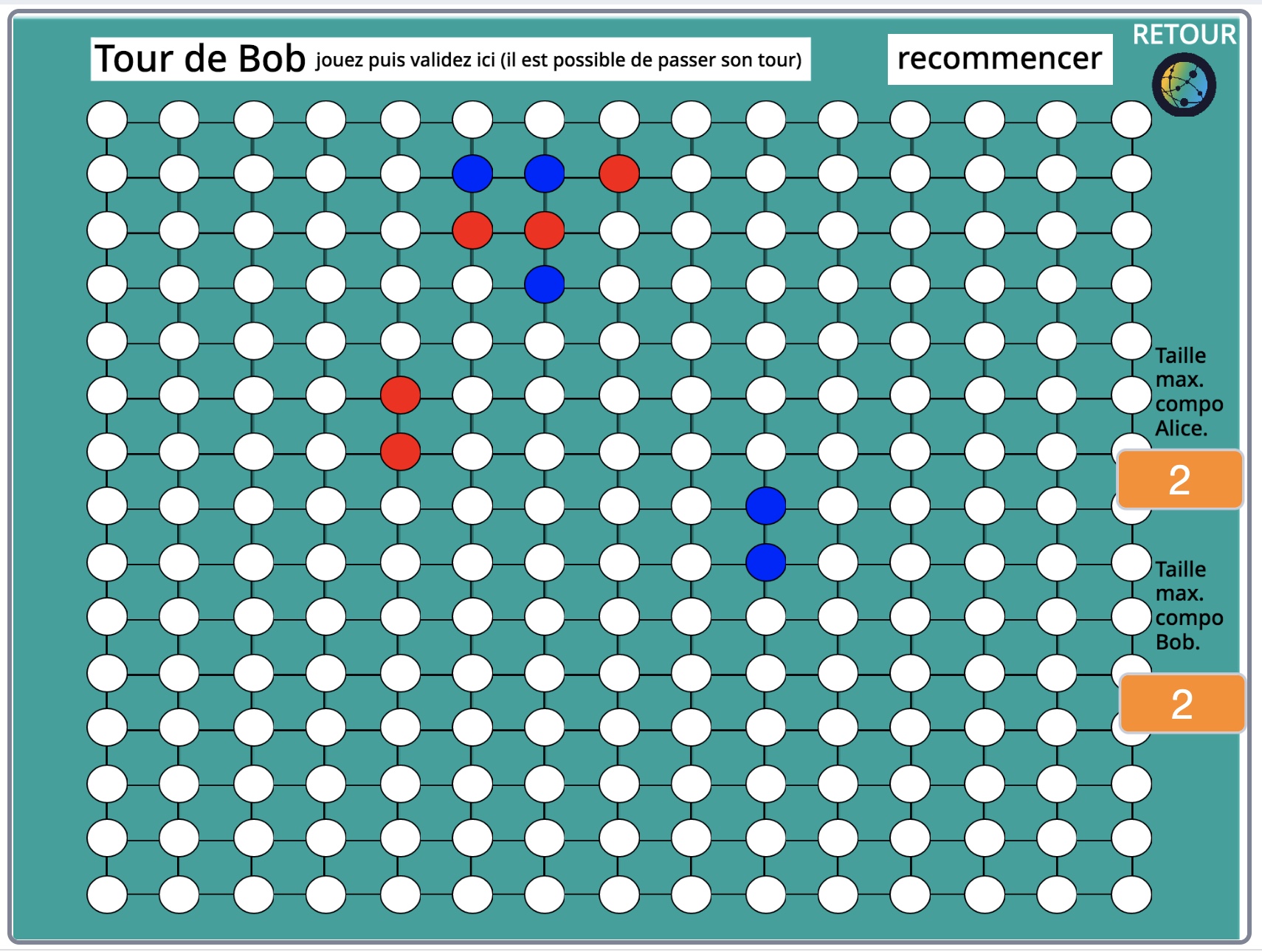 Alice et Bob, artistes peintres dans les graphes, vous proposent le jeu de la plus grande composante connexe. Découvrir ce jeu à deux joueurs dans les graphes : chacun voulant construire la plus grande composante de sa couleur.