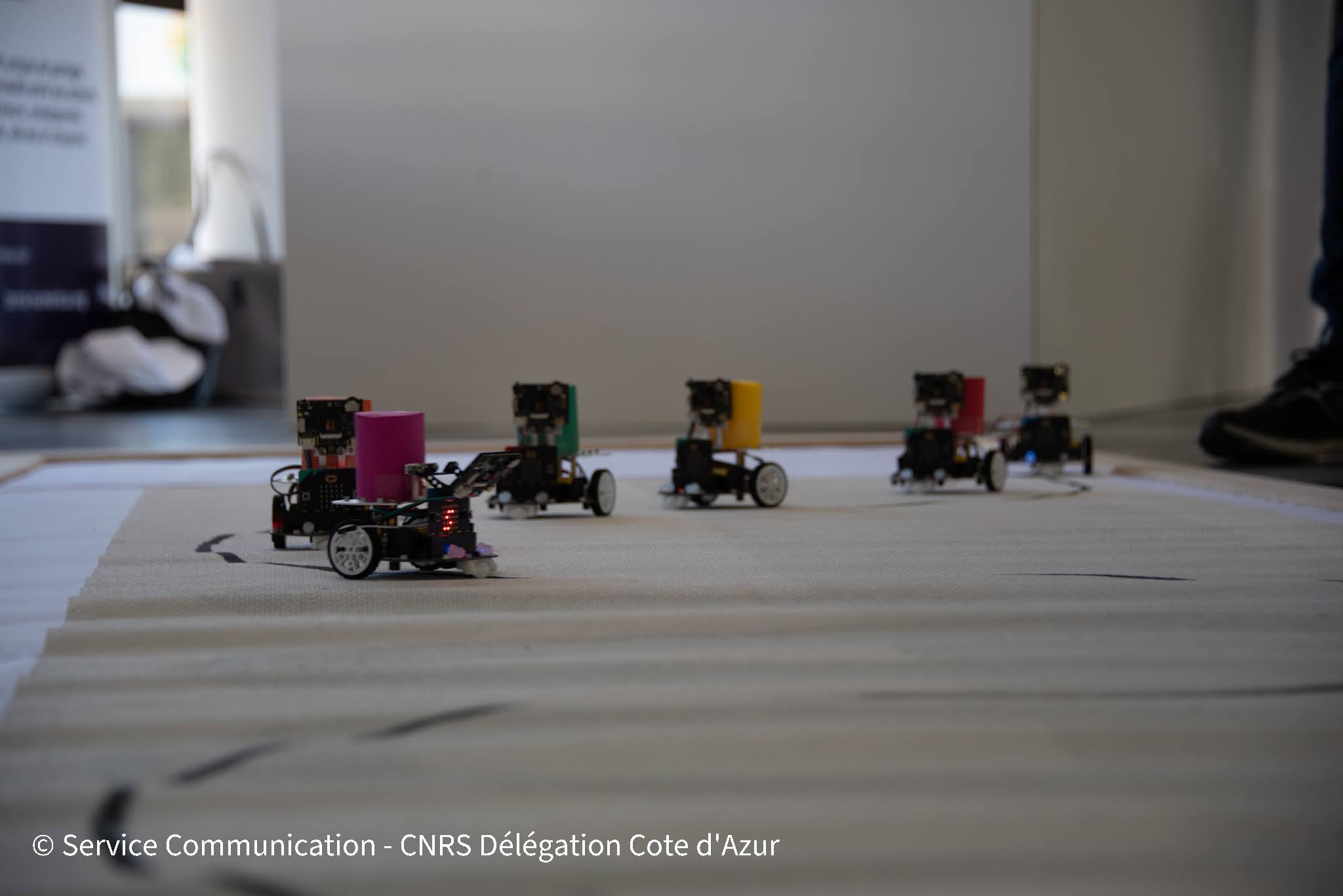 Ceci se fait à l'aide des robots équipés de caméra. Grace à celle-ci, ceux-ci peuvent, selon le mode programmé, suivre une ligne tracée au sol (mode traceur) ou bien suivre le robot qui les précède (mode suiveur). Suivant les niveaux, le médiateur pourra soit faire deviner aux visiteurs ce que font les modes, soit faire programmer les modes. (Ils ne nécessitent que peu d'instructions.) Ensuite, on lance le premier robot en mode traceur et les suivants en mode suiveur. On observe alors les trajectoires effectuées par les robots. Normalement, on constate que la trajectoire des robots se rapprochent de la ligne droite. La convergence vers la ligne droite est également montrée à l'aide de simulation sur ordinateur. Un visiteur trace à l'écran un parcours entre deux points A et B. Ensuite une succession de fourmis va se déplacer de A vers B. La première suit le parcours tracé par le visiteur, et chacune des suivantes se dirige à chaque instant vers la fourmi qui la précède. L'ordre entre observation sur les robots et observation sur la simulation est laissée à l'appréciation du médiateur.